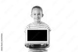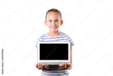Cute little european girl holding modern silver laptop and smiling isolated on white background. Free space for your text on the display