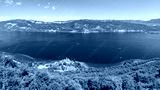 Panoramic view of the Lac du Bourget from the Belvédère d'Ontex (Ontex belvedere) on the heights of the Hautecombe Abbey in the Savoie department, south-eastern France.