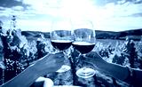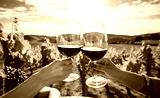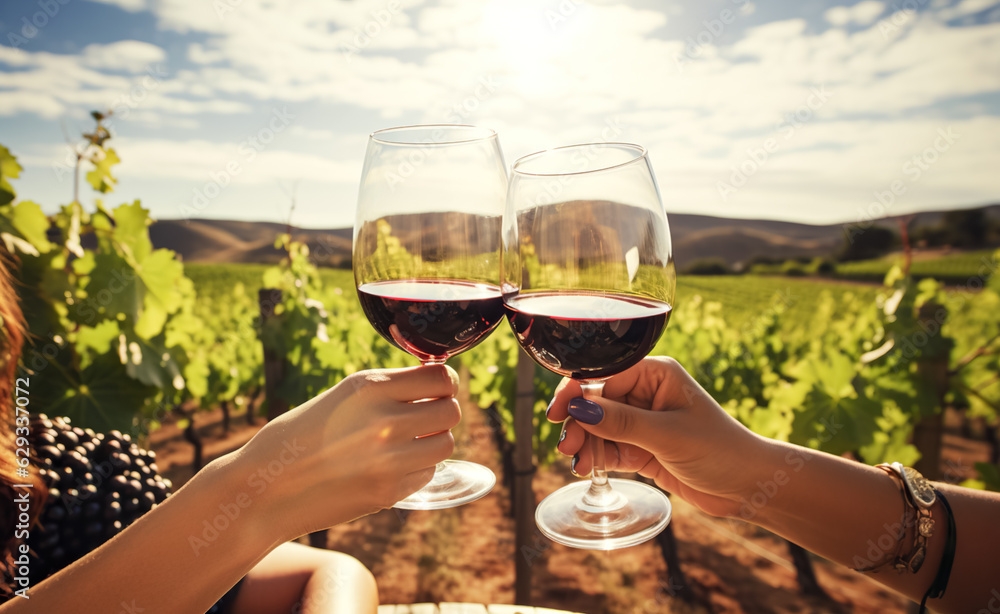 Friends toasting wine in a vineyard at daytime outdoors. Happy friends having fun outdoor. Young people enjoying harvest time together outside at farm house vineyard countryside. Autumn season