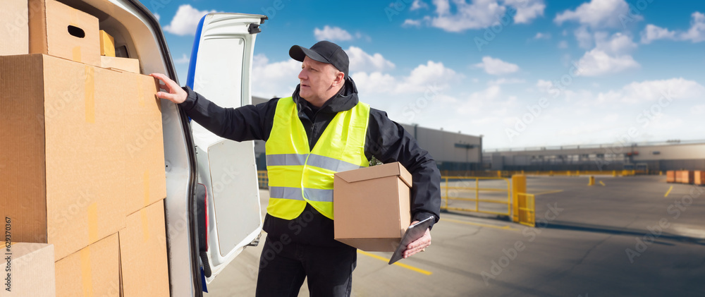 Postal worker. Minivan with parcels. Postal company courier with boxes. Delivery man picks up boxes from car. Courier with parcel is standing in parking lot. Postman in reflective vest