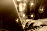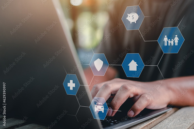 insurance, protection, assurance, family, health, saving, finance, life, shielding, health-care. typing keyboard and hexagon hud. that's hud is life insurance, and retire planning to ensure family.