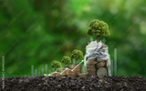 The tree grows on stacked coins on the soil. Renewable energy generation is essential for the future. Saving money for the future. Investment Ideas and green business growth.