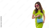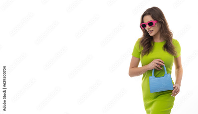 Positive young woman with colorful outfit on isolated white background.