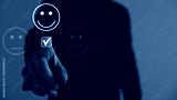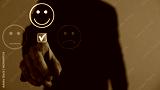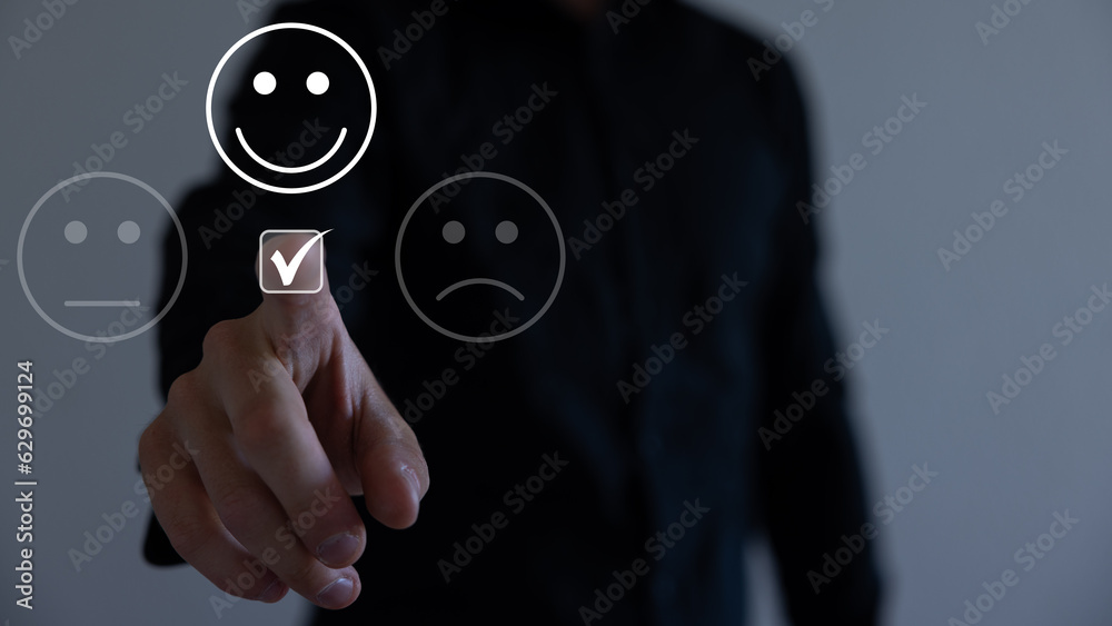 Customer service and Satisfaction concept, Businessman pressing smiley face emoticon on virtual touch screen. On the happy Smiley face icon to give satisfaction in service. Rating very impressed.