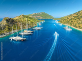 Aerial view of beautiful yachts and boats on the sea at in summer sunny day. Gemiler Island in Turkey. Top view of luxury yachts, sailboats, clear blue water, beach, mountain and green forest. Travel
