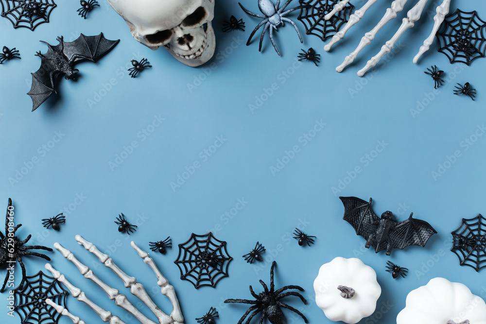 Halloween greeting card with pumpkin, skulls, bony hands and leaves