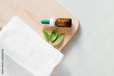 Glass dropper bottle mockup. Body care and spa. Natural cosmetics. skin care bottle. Bottle for essential oils and cosmetics lies on a white towel. Dropper. Spa still life with towel, wooden board