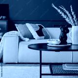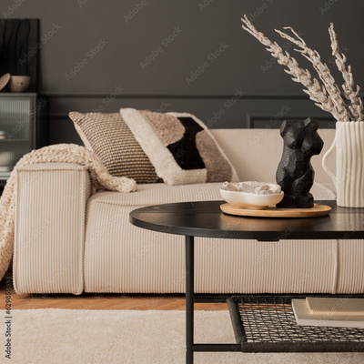 Living room interior with beige modular sofa, black coffee table, rug, pillows, plaid, vase with dried flowers, sculpture, trace, dark wall, lamp and personal accessories. Home decor. Template.