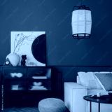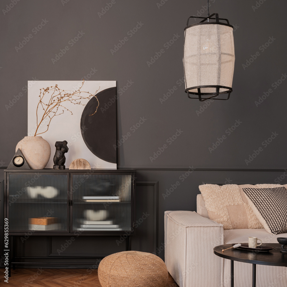 Creative composition of living room interior with mock up poster frame, glass sideboard, vase with dried flowers, modular sofa, wooden floor, dark wall and personal accessories. Home decor. Template.