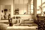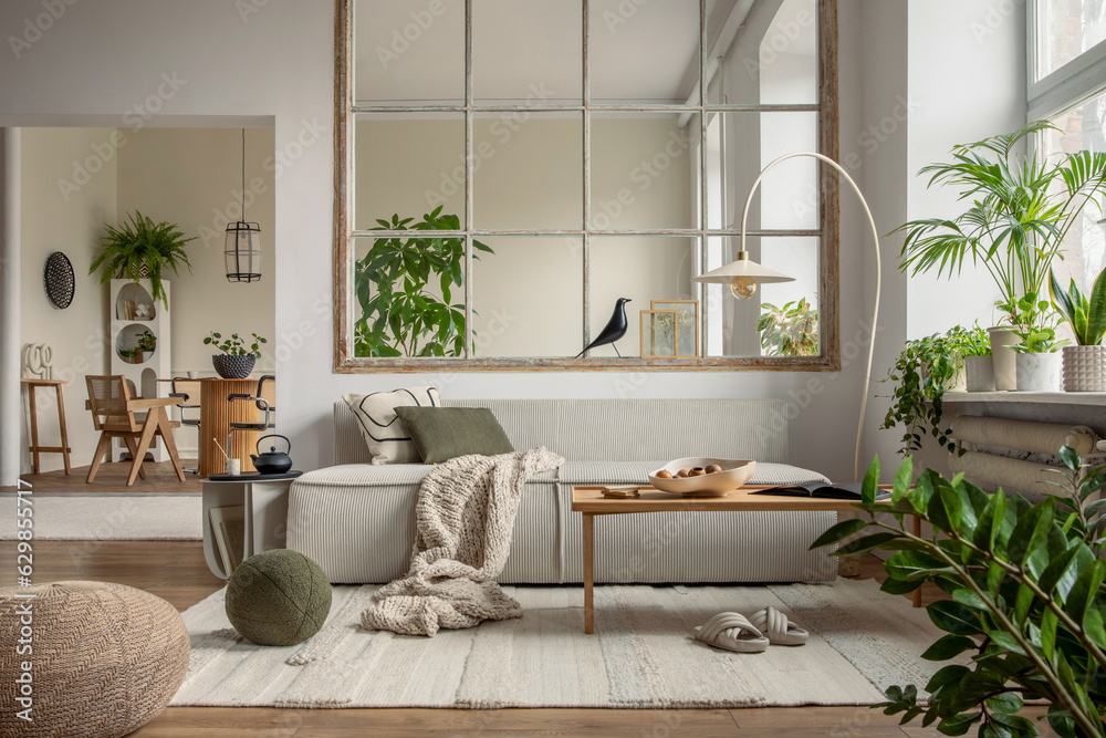 Open space interior with modular sofa, wooden coffee table, big window, patterned pillows, braided plaid, stylish lamp, wooden coffee table, plants and personal accessories. Home decor. Template.
