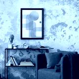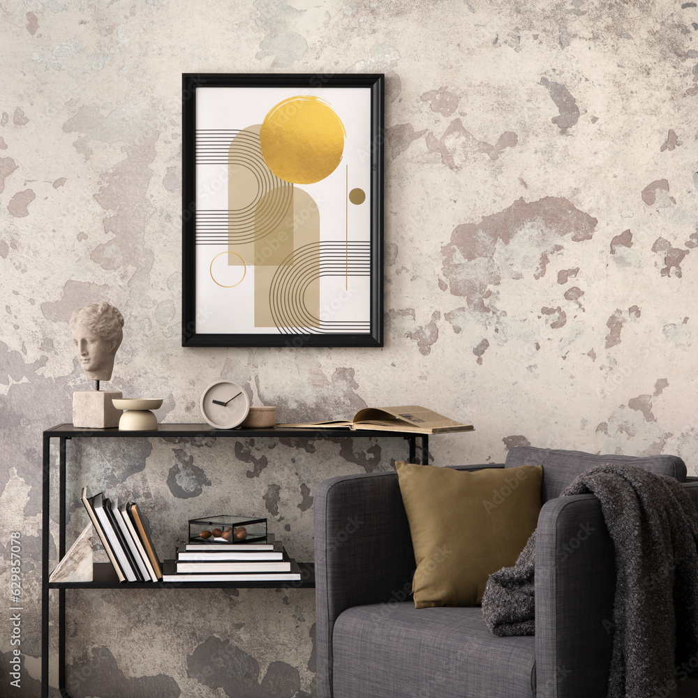Creative composition of living room interior with gray armchair with mock up poster frame, gray concrete wall, plaid and pillow, carpet, coffee table and personal accessories. Home decor. Template.