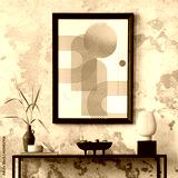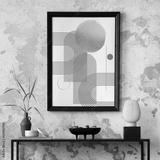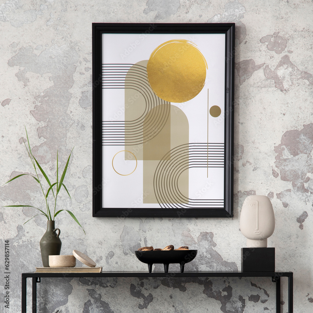 Creative composition of living room interior with mock up poster frame, black consola, grey pouf with plaid, carpet, coffee table and personal accessories. Home decor. Template.