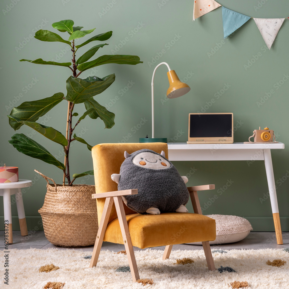 Creative composition of stylish and cozy child room interior design with green wall, plush toys, plant in basket; lamp, bright carpet, hut, desk, armchair, stool and lamp. Panels floor. Template...