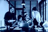 A group of businesspeople is standing and sitting at the office and working on project on a laptop.