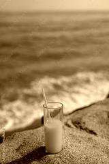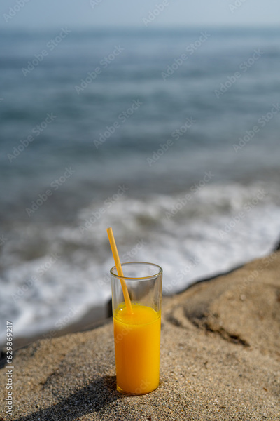 a glass of orange juice with a straw stands on the sand against the backdrop of the sea