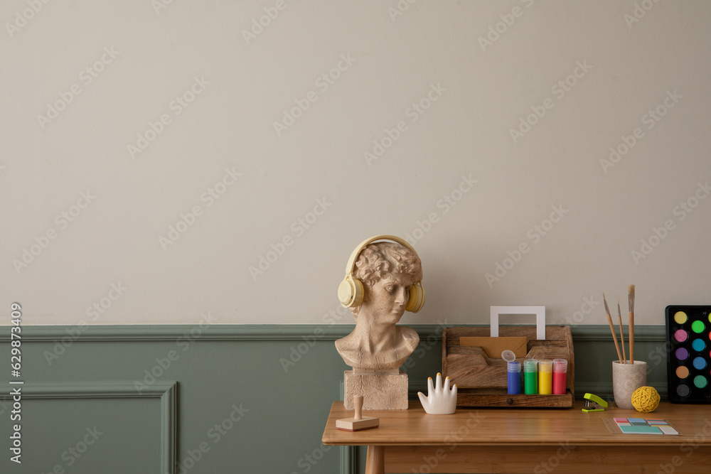 Creative composition of cozy office interior with wooden desk, armchair, mint lamp, books, stylish sculpture, pencils, beige and green wall with stucco and personal accessories. Home decor. Template.