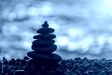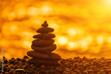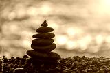 Balanced rock pyramid on pebbles beach. Golden sea bokeh on background. Selective focus, zen stones on sea beach, meditation, spa, harmony, calm, balance concept.