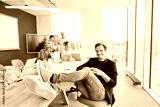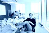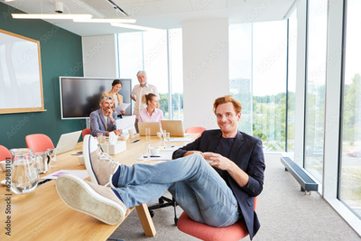 Portrait of smiling relaxed redhead businessman sitting with feet up on conference table near team discussing at office