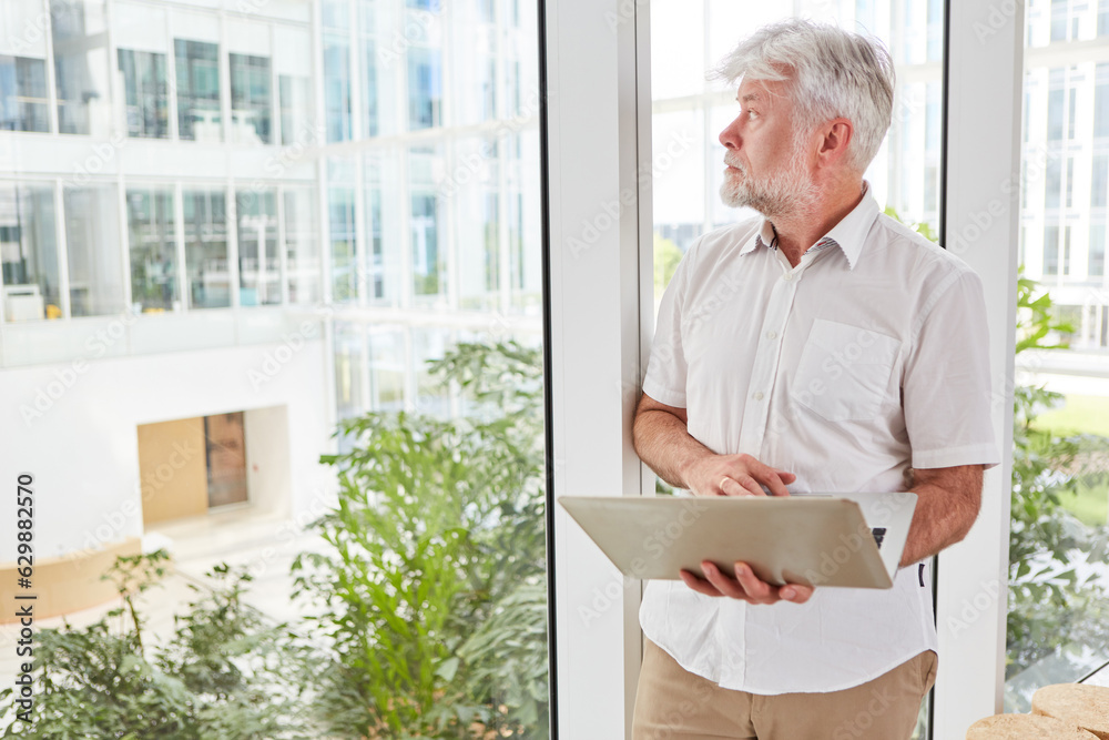 Thoughtful senior businessman with laptop looking out of window while leaning in office lounge