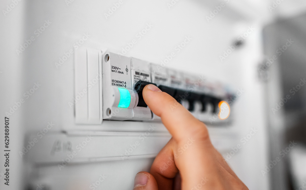 Male hand switching on fuse board.
