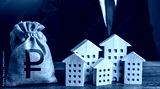 A businessman puts a russian ruble money bag near the houses. Investments in real estate assets. Municipal budget of the city. Official. Construction industry, rental business and hotel tourism.