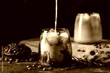 Ice coffee in a tall glass with cream poured over, ice cubes and beans on a dark concrete table.