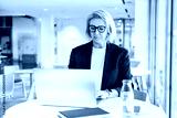 Portrait of concentrated 50's confident mature businesswoman, middle-aged experienced senior female professional working on laptop in open space office. Female entrepreneur working remotely