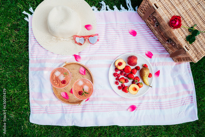 Top view pink drinks, cocktail with ice, raspberry, rosemary. Two glasses with martini, champagne, cider, lemonade on the tray on blanket with fruit plate, picnic basket. Cozy summer picnic on nature