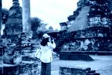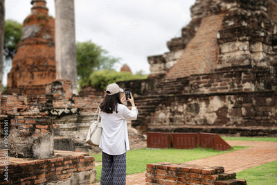 Asian women walking tour of ancient sites in Ayutthaya, Thailand, Historical park..