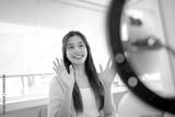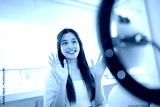 Charming Asian vlogger showing cosmetics advices products for her online beauty blog.