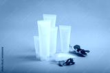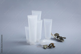 White empty plastic cosmetic tubes staying at gray background with eucalyptus branches, concept of cosmetology, body and skincare, beauty industry.