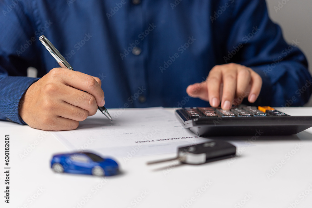 Man signing car insurance document contract agreement . Buying or selling new or used vehicle.