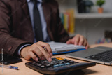 Businessman working on laptop and accounting financial marketing report document investment paperwork. hands of accountant using calculator to calculate tax refund economy.