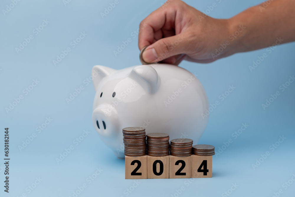hand putting coin piggy bank and stack coin cube wood 2024 on background.