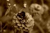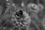 Bumble bee on pink Zinnia flower in the flowerbed . Bombus on summer