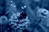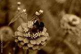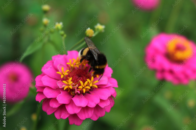 Bumble bee on pink Zinnia flower in the flowerbed . Bombus on summer