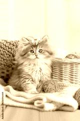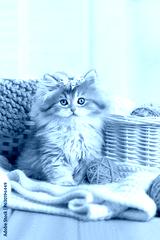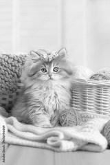 Small cute striped orange kitten sits among knitted things with balls of yarn. Pet on the background of the interior in light colors. Banner, advertising layout with a place for writing.