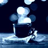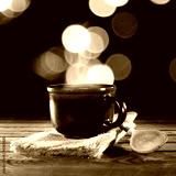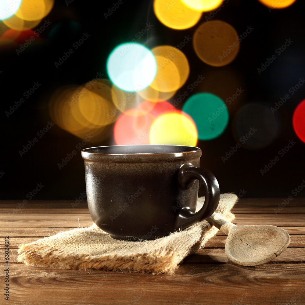 Cup of hot coffee or tea on linen cloth on wooden table with bokeh dark background
