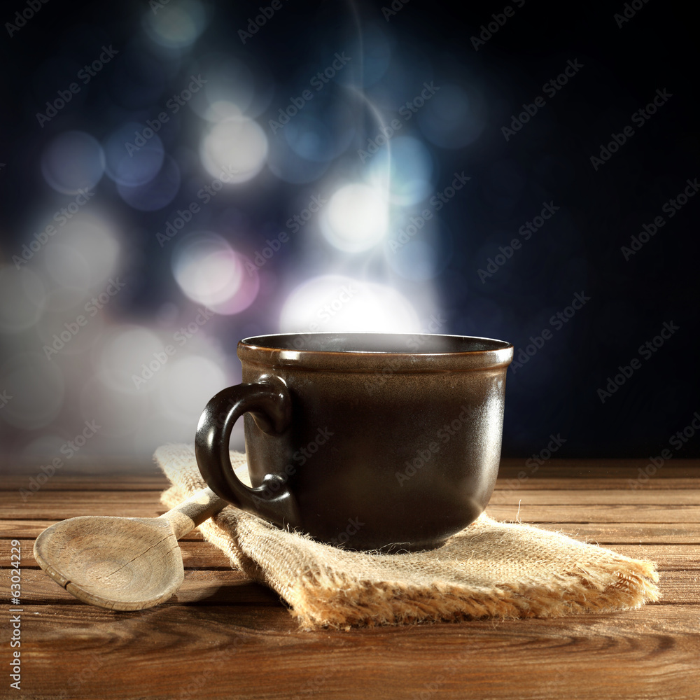 Cup of hot coffee or tea on linen cloth on wooden table with bokeh dark background