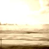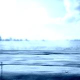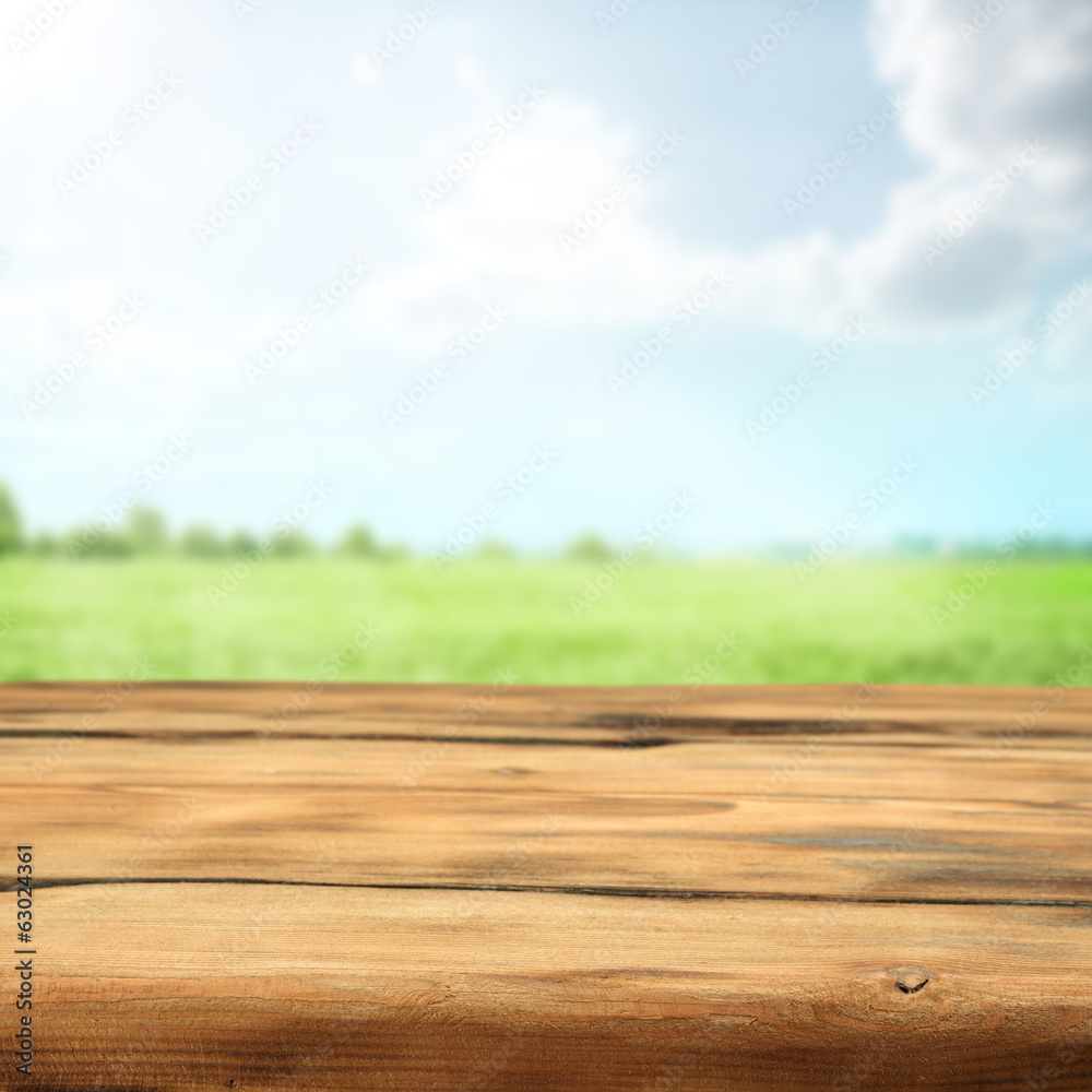 Empty wooden table with copy space for products on green spring field.. Wooden table and blue sky background.