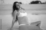 Portrait of young pregnant woman sitting on sandy beach in summer day.