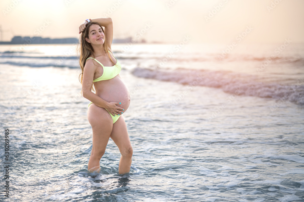 Beautiful pregnant woman in bikini standing on the beach at sunset.
