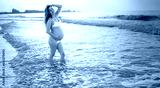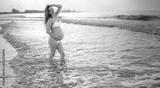 Beautiful pregnant woman in swimsuit posing on the beach at sunset.