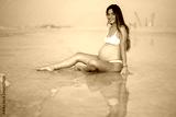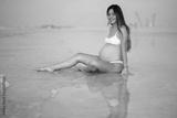 Young nine months pregnant woman relaxing on sandy beach in summer day.