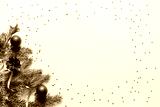 Happy new year frame. Christmas card banner with round red balls toys, Christmas tree branches, cones and golden decorative ribbon, golden stars. Mockup.