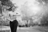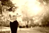 Beautiful Asian female jogger running in the park and looking at her watch to see her running timing in the park background.