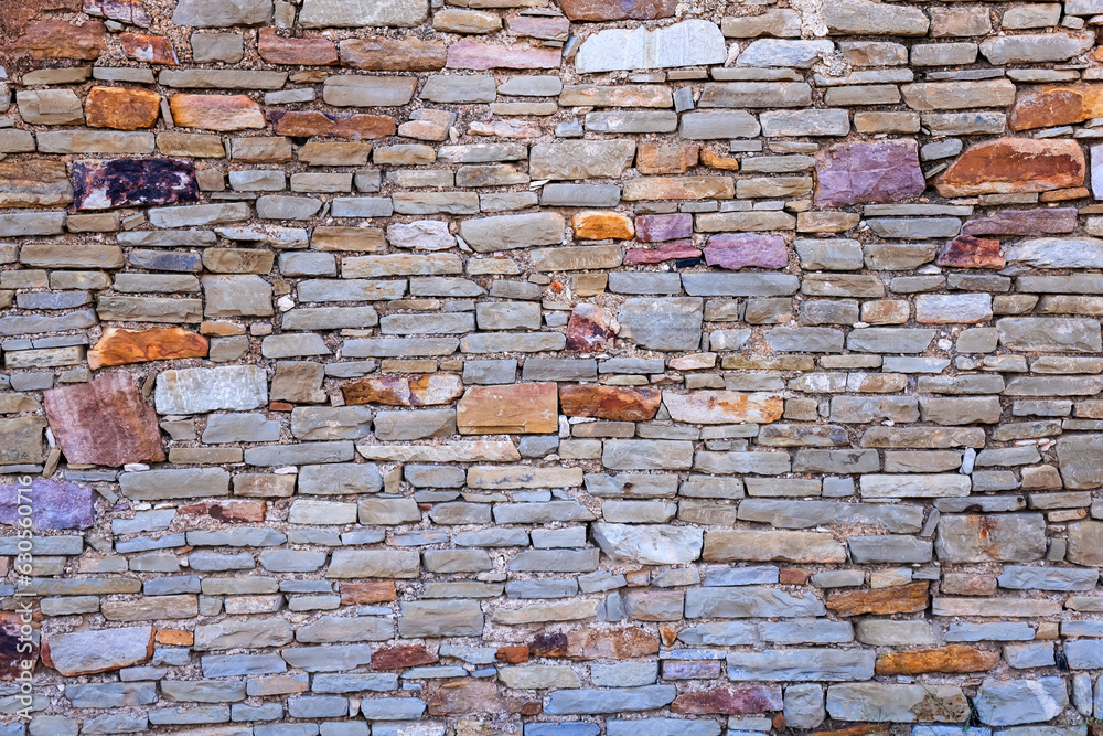 Colorful wall typical construction of using marble and slate stones in Rajasthan Fort walls in India.