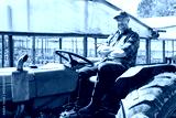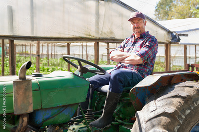 Mature farmer with arms crossed on green tractor