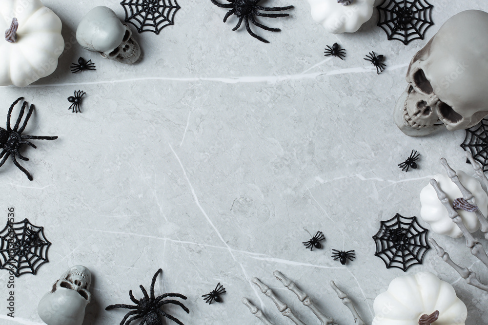 Halloween greeting card with pumpkin, skulls, bony hands and spiders
