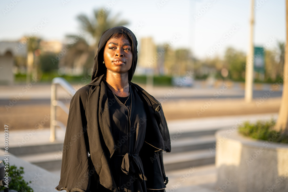 Beautiful muslim woman wearing traditional Abaya dress on city street at sunset.